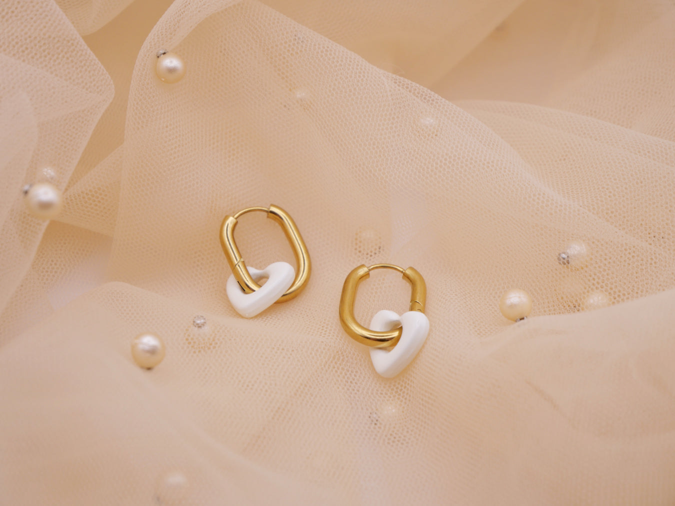 Symbole d’amour et de caractère, les boucles Amor mêlent la douceur d’un cœur blanc à l’éclat doré d’une base ovale en acier inoxydable.
