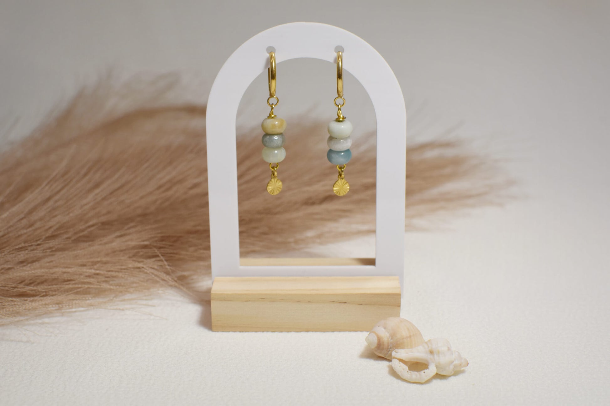 Inspirées par les nuances douces de l’eau, les boucles "Agua" associent des pierres naturelles aux tons pastel à une finition dorée en acier inoxydable. Un design simple, lumineux et apaisant.