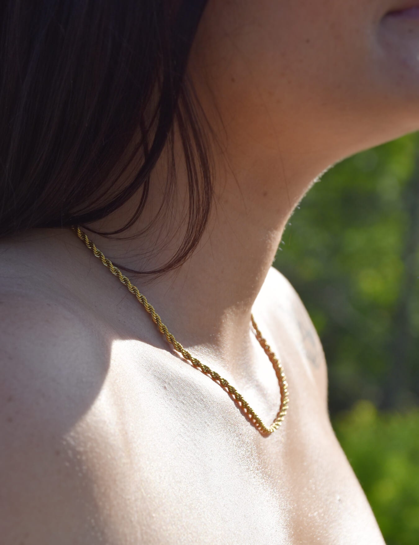 Un collier à maillons épais torsadés, au style affirmé et intemporel. Son éclat doré et sa texture sculptée apportent du caractère à toutes vos tenues, peut-être porté seul ou en accumulation