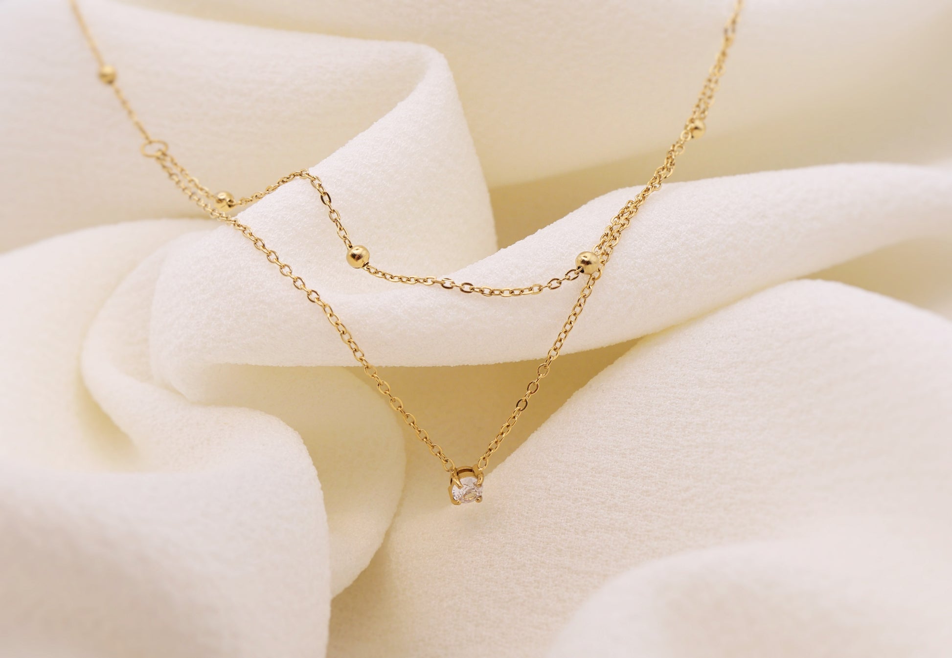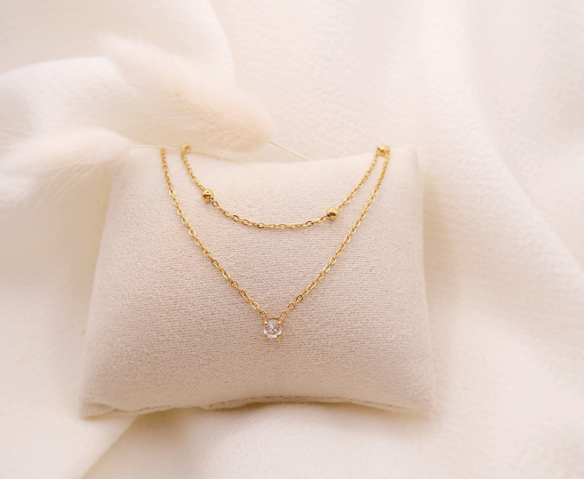 Sa double chaîne dorée crée un joli effet superposé ponctué de petites perles dorées, et un second rang mettant en valeur un zircon scintillant au centre.