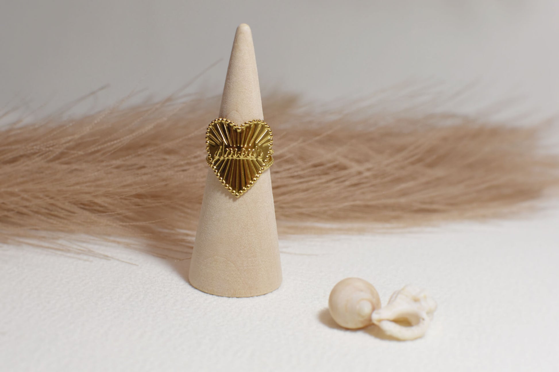 Avec son motif en forme de cœur doré et sa gravure délicate « amour », cette bague ajustable capture l’essence des émotions fortes. Féminine, lumineuse et symbolique, elle se porte seule comme une déclaration ou en accumulation pour un style affirmé